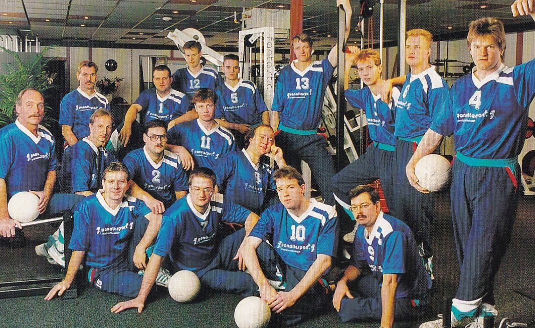 Achter: Jouke de Haan (Coach), Pieter Top, Gerard Broertjes, Andre Venderbosch, Henk Aalders, Alfred Oonk, Hans Deelen en Ger Spreeuwenberg. Midden: Rik vd Brink (Fysio), Johan Reekers, Richard Gesell, Marc vd Sangen en Uli Zingrebe. Voor: Henk Dost (TM, Ron Durge, Chrit Driessen en Nick Madlener.