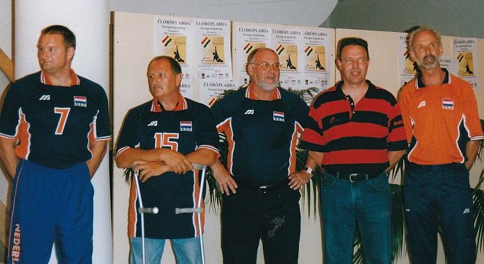 Voor: Gerard Kroon, Edwin Timmerman, Jan vd Meulen (fysio), Gerard Broertjes. Achter: Jacques van Dormolen (coach), Ron Durge, Pieter Top, Edwin vd Broek en Andre Venderbosch.