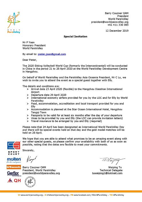 2020 21-28 April, Hangzhou . World Cup ParaVolley in China. De WPV gaat het 40 jarig Jubileum van Zit Volleybal vieren met een groot internationaal tournooi. Het toernooi in China wordt echter door een onstuimige Corona virus gecanceled. Pieter Joon vindt de gemeente Apeldoorn bereid om te kijken of het tournooi alsnog in Apeldoorn georganiseerd kan worden. Na een gedegen toets moet Apeldoorn helaas afhaken. Nu biedt Cairo (Egypte) zich aan als redder. Maar helaas ook hier gooit Corona definitief de internationale competities in het slot . World ParaVolley moet nu alle festiviteiten voor een 40 jarig Paralympisch jubileum Zitvolleybal afblazen. Het Bestuur van World ParaVolley heeft wel